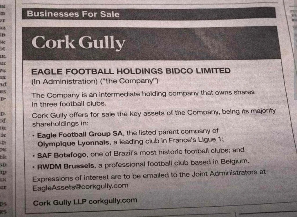 O Botafogo fora de campo segue uma confusão sem final e nesta terça-feira (14) o foi feito pela Cork Gully, nova adminstradora da Eagle Football, através do jornal britânico Financial Times que a SAF do clube está a venda.