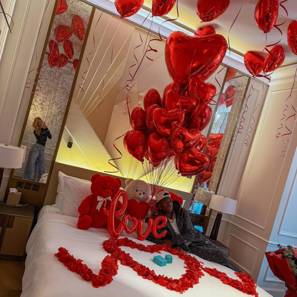 Nas imagens, os dois aparecem abraçados e trocando beijos, em meio a uma decoração repleta de petálas de rosa, balões, um grande urso de pelúcia e joias. A legenda da publicação trazia apenas “V❤️V”, uma referência às iniciais de seus nomes.